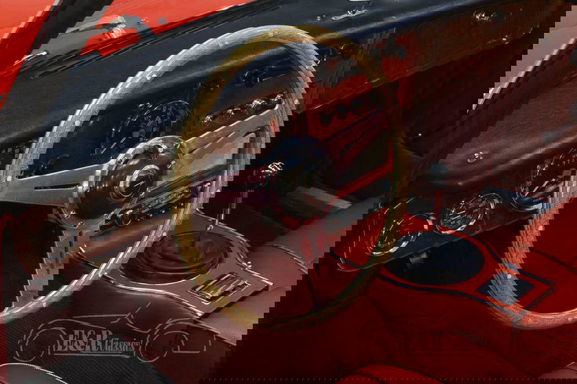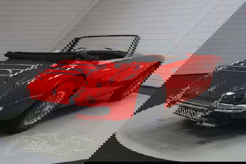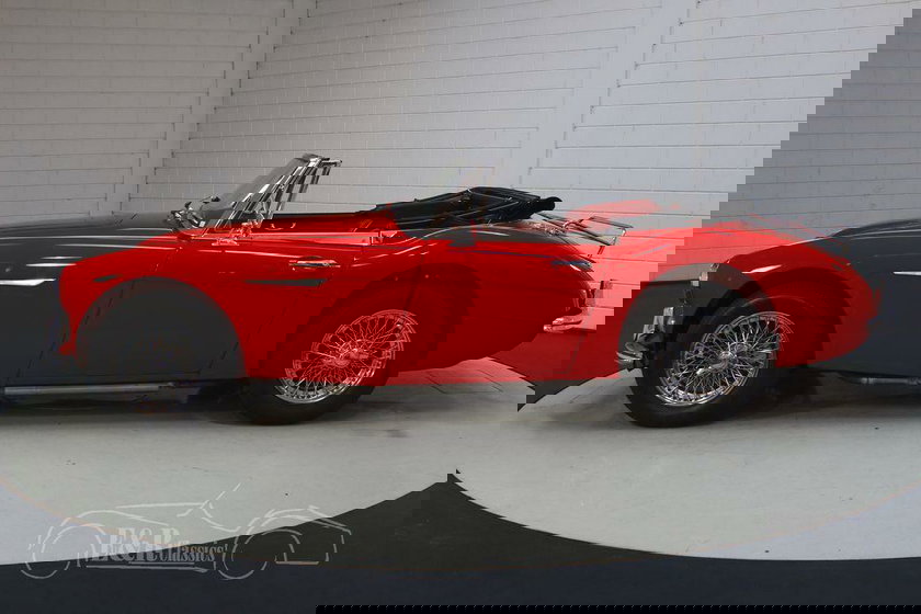 Cette Austin Healey est vraiment un spectacle à voir. La peinture rouge a fière allure sur ce classique et se combine très bien avec les roues à rayons chromés et tous les accessoires. L'intérieur a une sellerie en cuir rouge avec un tableau de bord et un volant en bois. Pour compléter le tout, la Healey est équipée d'une capote noire pour que vous puissiez également sortir par temps incertain.