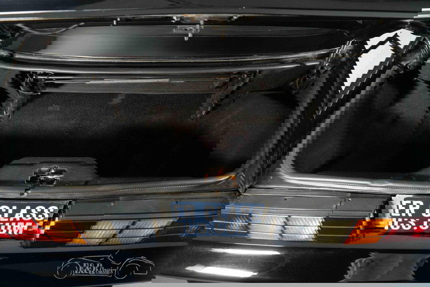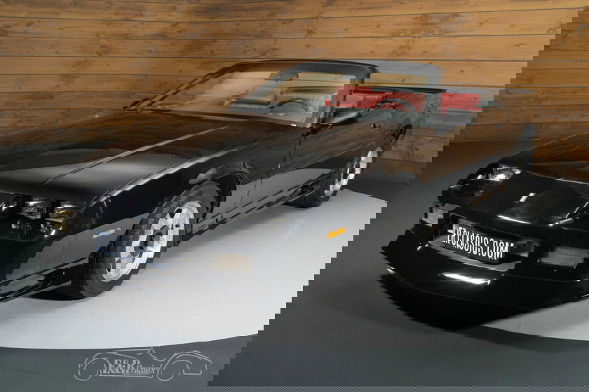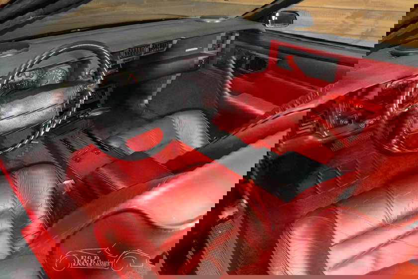 Cette Camaro RS attire également le regard. Sa peinture noire profonde met parfaitement en valeur le kit carrosserie sportif d'origine et les jantes cinq branches iconiques, conférant à la voiture une silhouette large et musclée. La capote noire se fond harmonieusement dans le style général, mais c'est l'intérieur entièrement rouge qui confère à cette voiture son caractère exceptionnel. La sellerie rouge, la moquette assortie et les accents noirs contrastants du tableau de bord créent une combinaison saisissante et pleine d'atmosphère. Un style élégant et abouti, typique des cabriolets américains flamboyants de cette époque.