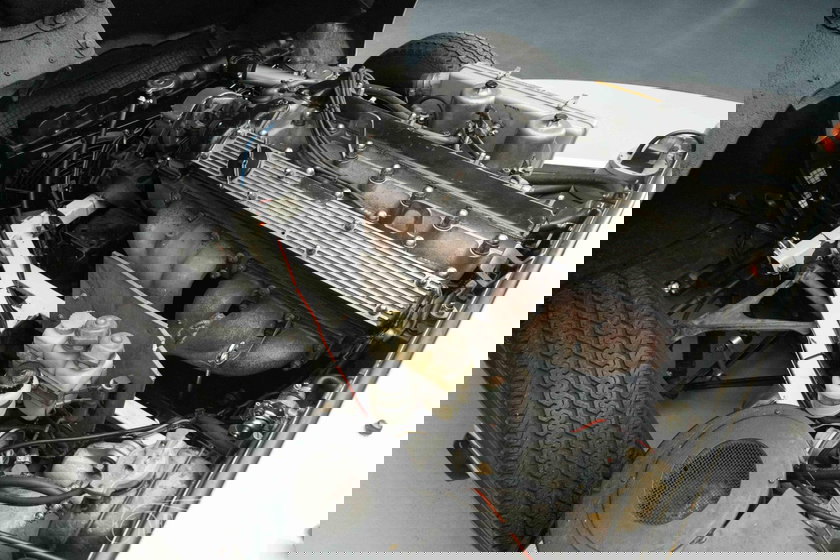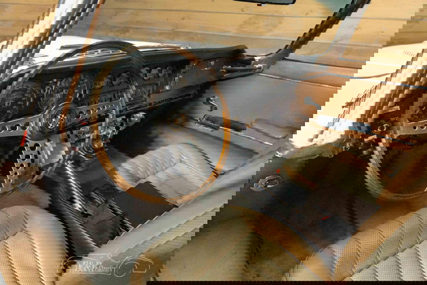 La peinture Old English White souligne les lignes élégantes et musclées de la Série 2 et s'harmonise parfaitement avec les accents chromés et les jantes classiques. À l'intérieur, l'habitacle marron crée un contraste chaleureux et raffiné avec le tableau de bord caractéristique de Jaguar et la position de conduite sportive et basse. Son allure générale est élégante et intemporelle, conférant à cette Jaguar Type E une présence remarquable, aussi bien en concession que sur la route.