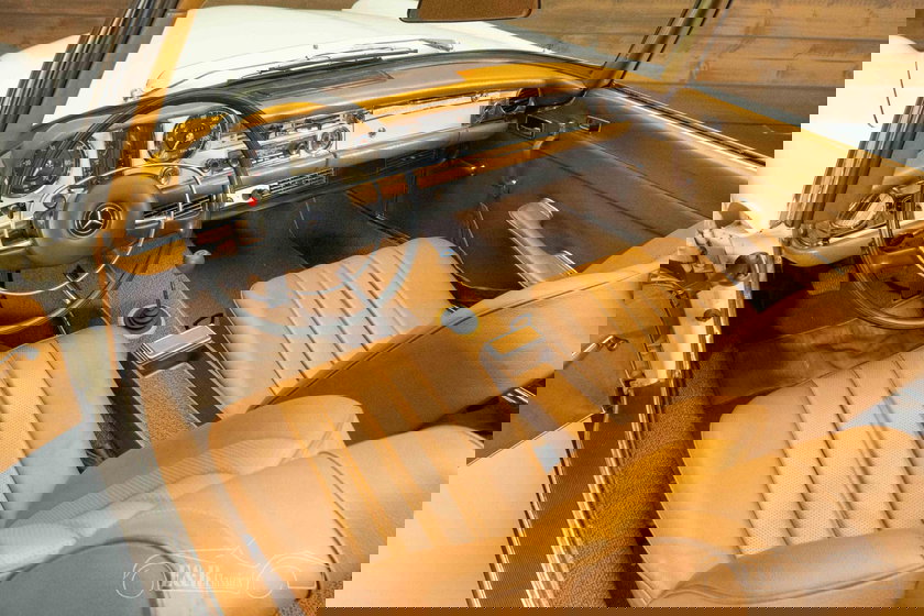 Sa peinture beige élégante s'accorde parfaitement avec le caractère raffiné de la Pagode. Livrée avec un toit rigide et une capote souple marron foncé, elle est utilisable en toute saison. L'intérieur est habillé d'un cuir cognac chaleureux, qui contraste élégamment avec l'extérieur et crée une ambiance luxueuse et classique. Le tableau de bord, avec ses détails soignés et sa radio Becker, renforce cette impression d'authenticité, tandis que l'harmonie des couleurs et des matériaux lui confère une allure intemporelle.