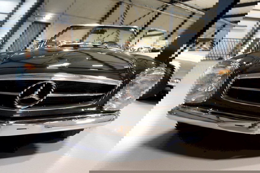 Il s’agit d’une belle 280SL Pagode, d’origine pour la carrosserie, avec une boîte manuelle 4 vitesses, une voiture qui passe bien les vitesses et roule correctement, nécessitant seulement quelques petites améliorations pour être prête à rouler. Les pare-chocs ont récemment été remplacés de la version US à la version européenne. Il est possible que des pneus à flancs blancs ajoutent de la valeur.