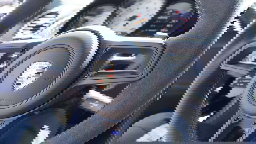 Porsche logo op opbergvak middenconsole in Race-Tex