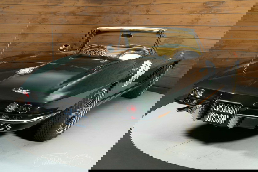 Het exterieur van deze Corvette straalt klasse uit met zijn diepe, donkere Glen Green lakwerk, perfect gecombineerd met een beige softtop en stijlvolle "Knock Off" velgen die het sportieve karakter benadrukken. Het luxe interieur is afgewerkt met beige bekleding, wat prachtig contrasteert met het exterieur en een warm, elegant geheel creëert. Authentieke details zoals de originele Delco AM/FM-radio, het houten stuurwiel en de chromen accenten brengen de jaren 60 tot leven, terwijl het dashboard en de vloerbedekking in bijpassende tinten de harmonie van het interieur versterken.