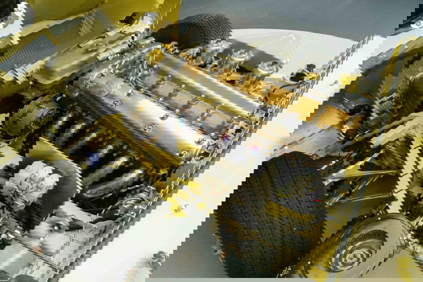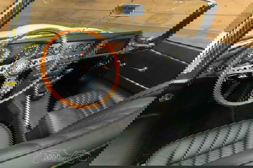 Optisch is deze E-Type minstens zo indrukwekkend. De carrosserie is uitgevoerd in het originele, Matching Numbers lakwerk ‘Pale Primrose Yellow’, een frisse pastelgele kleur die de slanke lijnen en gespierde wielkasten prachtig accentueert. De chroomdetails en de klassieke spaakwielen vormen een stijlvol contrast en onderstrepen het tijdloze ontwerp. Het Matching Numbers zwarte lederen interieur oogt als nieuw en sluit naadloos aan bij de zwarte soft top, waardoor het geheel een chique en sportieve uitstraling krijgt – zowel open als gesloten. In het interieur vindt u het karakteristieke dashboard, klassieke Smiths-meters en het houten sportstuur; samen creëren ze precies die authentieke E-Type sfeer waar verzamelaars en liefhebbers naar zoeken.