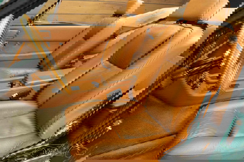 Qua uitstraling is deze Jensen Interceptor een waar stijlicoon. Het groene metallic lakwerk vormt een prachtig contrast met de beigekleurige soft top en het luxe bruine interieur. Zowel de soft top als de ramen zijn elektrisch bedienbaar, een zeldzame luxe voor die tijd. Het dashboard is rijk uitgerust met klassieke meters en schakelaars, terwijl de comfortabele zetels zorgen voor een stijlvolle rijervaring. De originele Jensen velgen met groene accenten maken het geheel compleet en benadrukken de sportieve elegantie van dit Britse meesterwerk.