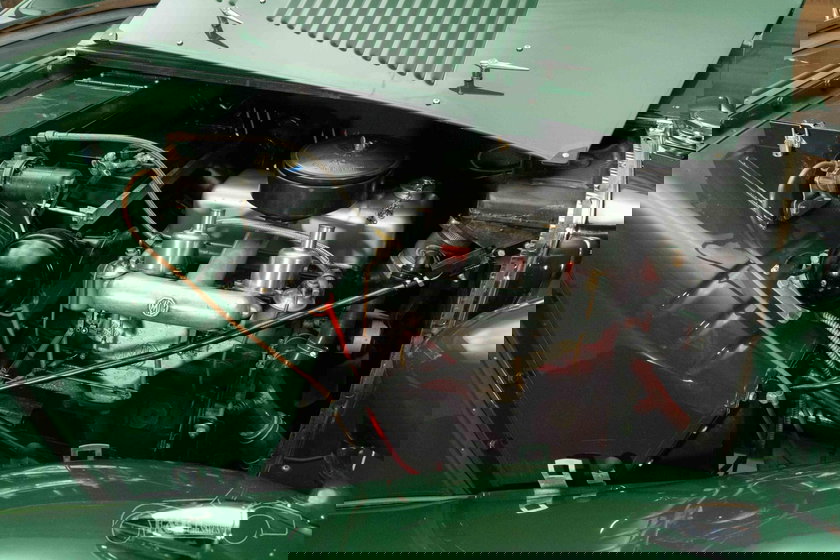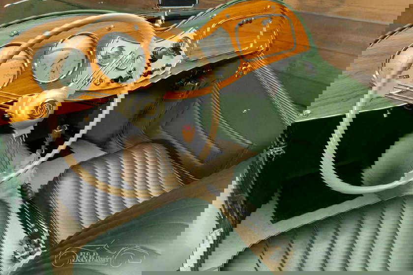 Het exterieur van deze MG TD is uitgevoerd in het iconische British Racing Green, een kleur die perfect past bij de sportieve maar elegante uitstraling van de auto. Het groen wordt prachtig geaccentueerd door de tan kleurige soft top met bijpassende zijraampjes, die het geheel een verfijnde uitstraling geven. Het interieur is net zo indrukwekkend, met een stijlvol groen interieur dat zowel comfort als authenticiteit biedt. De houten details op het dashboard versterken het klassieke karakter van de auto. Elke rit in deze MG TD is een unieke reis door de geschiedenis van de Britse automobielindustrie.